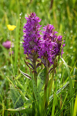 A close-up of a purple flower with dew drops on its petals, surrounded by green grass and a yellow flower in the background. | Broad-leaved Marsh Orchid, Dactylorhiza majalis. Wild orchids, nature habitat. | 292c79892d379052aadc3cdf6a86203dab24bc7acf071f145b84822fc3644912 | 001065732510 | 0 | 0 | 23 | 9 | 0 | 0 | |