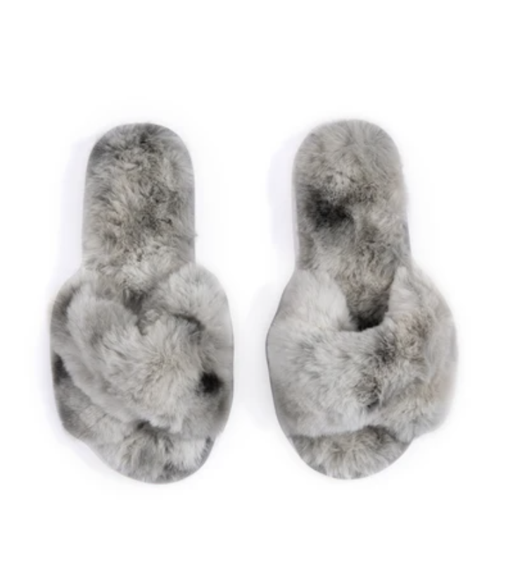 A pair of fluffy, grey slippers with a textured surface and a curled toe design. The slippers are placed on a white background, and each slipper has a distinct curl at the toe end. | Grey Stowe Tie Dye Slipper | 42312d43e8974d782277c2b423da979fe6b5118f339e48070af1e637a906e490 | 001065733052 | 0 | 0 | 34 | 5 | 0 | 0 | |