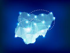 A stylized map of Nigeria with a network of glowing blue lines and dots, representing connectivity and data flow, set against a dark blue background. | nigeria country map polygonal with spot lights places - stock illustration | 85192f8f88add01feb824c36e2b0dea3372360208a1cf9ff1395553b5d3858d1 | 001065732983 | 0 | 0 | 25 | 11 | 0 | 0 | |