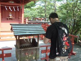 A person is standing on a wooden bridge with a red railing, looking at a small, open, wooden structure with a thatched roof. The structure has a metal grate on top and is placed on a wooden platform. The person is wearing a black t-shirt with a backpack featuring a floral design on the back. The scene is set in a park ... | A Gaijin's Prayer by OniUsagi02 | 9e6bbf5e5dcf4485512a482e1cbb69f03adb5d1afdb8cb1cc57776b964a5d323 | 001065733071 | 0 | 0 | 71 | 5 | 0 | 0 | |