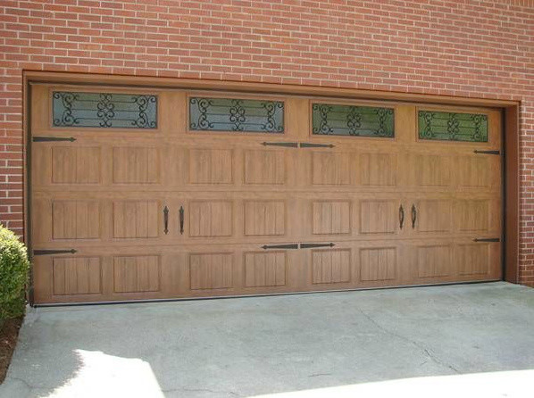 A brown wooden garage door with a decorative metal design in the upper section and a glass window in the center. The door has vertical panels and is attached to a brick wall. There is a small bush to the left of the door and a shadow cast on the ground in front of it. | Garage doors for Atlanta garage door experts | c45a4abdd17581ad1e937af3aa802d5b5faee3e45e3a79316bf0f96b2ac415b9 | 001065733017 | 0 | 0 | 55 | 7 | 0 | 0 | |