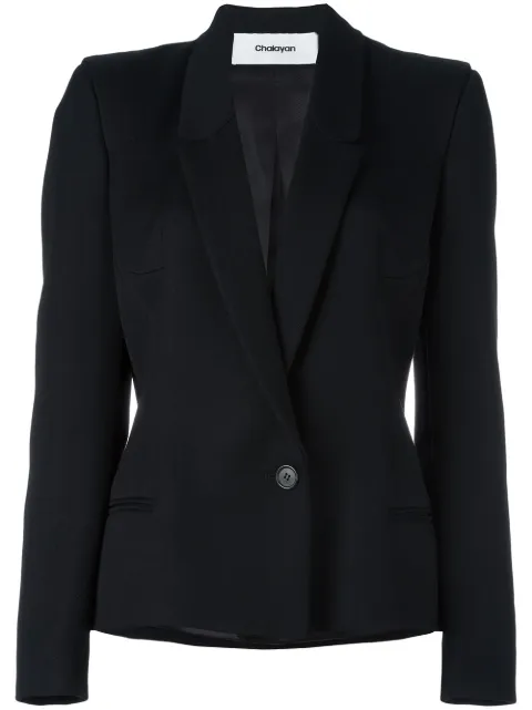 A black modern business suit with a fitted blazer and a matching skirt is displayed on a mannequin. The suit has a lapel collar, buttoned cuffs, and a zipper closure. The blazer has two front pockets with buttoned flaps and a breast pocket with a buttoned flap. The skirt is knee-length and has a zipper closure at the b... | Chalayan Signature Fitted Jacket - Black | 27683978671db08ce21c1dcb0f98601b4f4df04909312320afe1c7df906f850e | 001065732843 | 0 | 0 | 69 | 6 | 0 | 0 | |