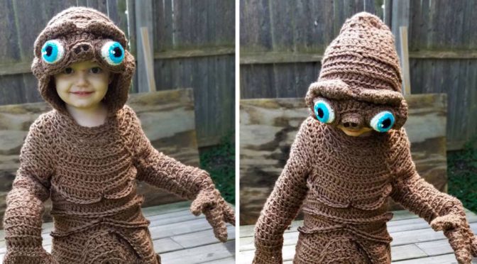 A child is wearing a brown knitted costume with large, blue, knitted eyes and a knitted nose, resembling a monster. The child is standing on a wooden deck with a wooden fence in the background. | Freehand Crochet E.T. Costume by Stephanie Pokorny | abf999ff1dd7359ff524e2be3ea71b058434f00d1f147ad36d9c92f7ddd19a61 | 001065733542 | 0 | 0 | 35 | 7 | 0 | 0 | |