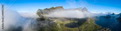 Aerial view of a mountainous landscape with a large body of water in the foreground. The mountains are partially obscured by clouds, and the sky is clear with a few wispy clouds. The water reflects the mountains and the sky, creating a serene scene. | Obraz na pl\xc3\xa1tn\xc4\x9b Travel concept with aerial panorama of Norwegian fiords with sea and mountains | 75d17eb86fb2a6319795d1df28819415996e6c47c6209799c1a0a22a7ca8ffa2 | 001065733882 | 0 | 0 | 44 | 15 | 0 | 0 | |