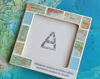 A framed picture of a white triangle with a black outline, placed on a map background with various countries and geographical features. The frame has a quote 'Distance means so little when someone means so much.' written on the bottom. | Long Distance Relationship Atlas Map Custom Text Photo Picture Frame | 0d9071d445280717280109645d0f51e543022989dfb9cbfb9e74ead86707b9dc | 001065733769 | 0 | 0 | 40 | 10 | 0 | 0 | |