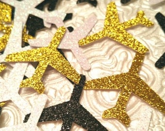 The second image shows a collection of various airplane shapes and sizes, all with a metallic gold and black glitter finish. The airplanes are scattered across a textured white background with a pattern that resembles a map or a fabric texture. The glitter effect gives the airplanes a festive and celebratory appearance... | Airplanes! Glitter plane confetti die cuts table scatter decor for pilot flight attendant birthday party favor decor 100 count | 9d01d19494d19575c18c62ee0650ca837bedfad3fc5d5e546aba0bdfdaae2f09 | 001065733544 | 0 | 0 | 52 | 19 | 0 | 0 | |