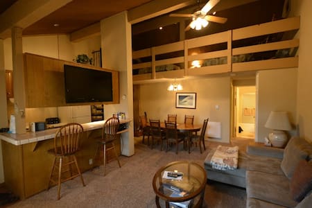 A spacious open-concept living area with a kitchen, dining area, and living room. The kitchen features wooden cabinets, a large flat-screen TV mounted on the wall, and a bar with stools. The dining area has a wooden table surrounded by chairs, and the living room has a couch with a blanket and a coffee table in front o... | Centrally located Mammoth Condo - \xe7\x8c\x9b\xe7\x8a\xb8\xe6\xb9\x96 | e80ded4fab6d51a8ebdf110987fd919bf35a6992decb356e2b6ae951e84738dc | 001065733490 | 0 | 0 | 70 | 6 | 0 | 0 | |