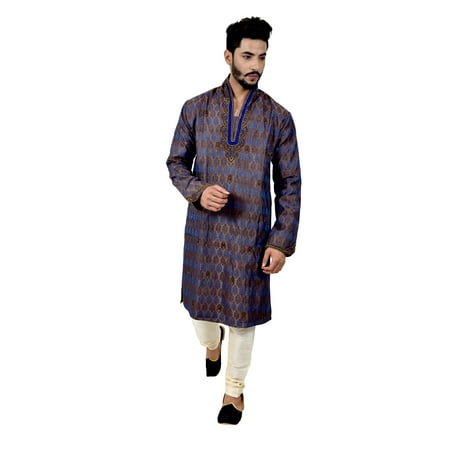 A man is wearing a traditional Indian kurta with a blue and brown pattern, a blue necktie, cream-colored churidar pants, and black shoes. | Indian Traditional Brocade Silk Multicolour Kurta Pajama for Men. This product is custom made to order. - image 1 de 6 | 3c3945b7d3c7795795088be85528d3b9feee3902a8350faf0b787609b6cbcd5c | 001065734030 | 0 | 0 | 23 | 21 | 0 | 0 | |