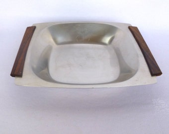A sleek, modern silver bowl with a smooth surface and a wooden rim sits on a white tablecloth. | VINTAGE DANISH Stainless Serving DISH | a914856f6c5aeb48510901c980d786af6f97867f8a2966a5f4ccc104643a4179 | 001065733878 | 0 | 0 | 18 | 5 | 0 | 0 | |