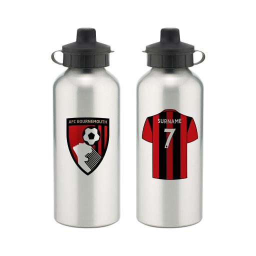 Two identical silver water bottles with black caps are displayed side by side. Each bottle has a black and red AFC Bournemouth logo on the side, featuring a soccer ball and a shield. The logo includes the number '7' and the word 'SURNAME' in white text. | Swansea City A.F.C Personalised Aluminium Water Bottle SHIRT | d21110546599ce52c822d7552088b4639effe910fff8c4f502b1450c30ee3c90 | 001065733968 | 0 | 0 | 46 | 8 | 0 | 0 | |