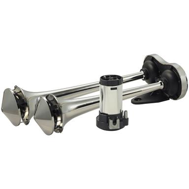 A pair of shiny, new-looking car exhaust pipes with a black mounting bracket on the right side. The pipes are positioned vertically and are set against a white background. | Wolo Powerhouse Roof-mount Dual Trumpet Horn | 974ac02a84d4a25ff8a39a3403c1161d69b9f8162069c3239d2202e9e15a2912 | 001065734258 | 0 | 0 | 29 | 6 | 0 | 0 | |