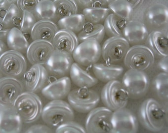 A close-up view of a collection of white pearls with a textured surface. The pearls are of various sizes and are densely packed together, creating a monochromatic and uniform appearance. The lighting is soft and diffused, highlighting the sheen of the pearls and the intricate details of their surfaces. | Domed Pearl Buttons with wire shank Lot of 50 | 5531979bf21ca19e34625dbcbc623877ee88acc3a60d46b2120b23558bfcc25d | 001065734160 | 0 | 0 | 49 | 9 | 0 | 0 | |