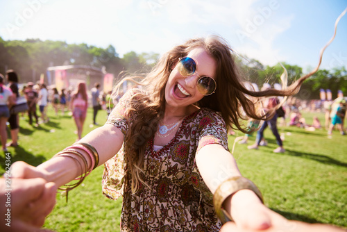 A woman with long hair wearing a patterned dress and bracelets is dancing at an outdoor festival. She is wearing sunglasses and has a necklace around her neck. Her hair is flowing in the wind, and she is smiling and looking upwards. In the background, there are other festival-goers and a stage with a banner. | Photo sur Toile Magasin de musique Portrait of young boho woman having fun at festival | 98dbea3325233f2eca6c6fb2dd42496f11017257d0c05a6c31f233b8bce93c49 | 001065734302 | 0 | 0 | 55 | 15 | 0 | 0 | |