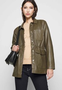 A woman is wearing a green leather jacket over a beige sweater and black pants. She is holding a black handbag in her left hand. | River Island - Collegepaita - camel - 3 | cdef71313865df3efe587d5a0d4855296b4937f519627fb621d08c56cd6a7308 | 001065734410 | 0 | 0 | 25 | 8 | 0 | 0 | |