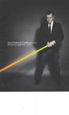 A man in a dark suit and tie is holding a yellow laser pointer, standing in front of a dark background with a shadow cast on the floor. The image has a vintage feel with a text overlay that reads 'SAC DE COTILLON' and 'HUMOUR GLAMOUR COURAGEUX' in a foreign script. | PUBLICITE ADVERTISING 2012 JEAN CHARLES DE CASTELBAJAC haute couture | 40e9ddce2a6d089874922dbb3e43fc74a2fd0d8cfe9afb702c753da214d4462d | 001065734475 | 0 | 0 | 51 | 9 | 0 | 0 | |