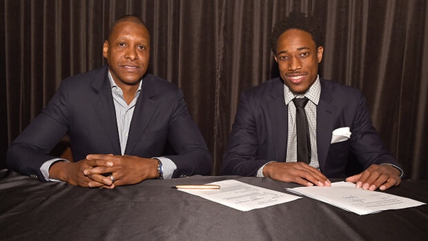 Two men are seated at a table with papers in front of them. The man on the left is wearing a dark suit with a tie and has a watch on his left wrist. The man on the right is also wearing a dark suit with a tie and has a pocket square. Both men have their hands resting on the table. | Arthur doesn't believe Ujiri assured DeRozan that he wouldn't be traded | 5d1792e8b520acea89a25447d8b0f47e71aca3ef248db459ad0a531a861c5f3d | 001065734513 | 0 | 0 | 62 | 11 | 0 | 0 | |
