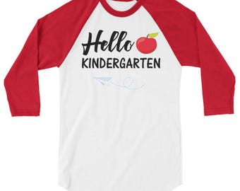 A red and white baseball-style t-shirt with the phrase 'Hello Kindergarten' written in cursive on the front. The shirt has a red sleeve and a white body with a red trim around the collar. On the left side of the shirt, there is a small red apple with a green stem and a blue string tied around it. | Hello Kindergarten Raglan Baseball T-Shirt Back to School Shirt Teacher Student Funny Tee 3/4 sleeve Kids Children Shirt Teen Adult 6120 | a1bfbe6f55175e045c753fa54d82be6d2786dc206667923812c0a5abd5ae5850 | 001065734447 | 0 | 0 | 58 | 21 | 0 | 0 | |