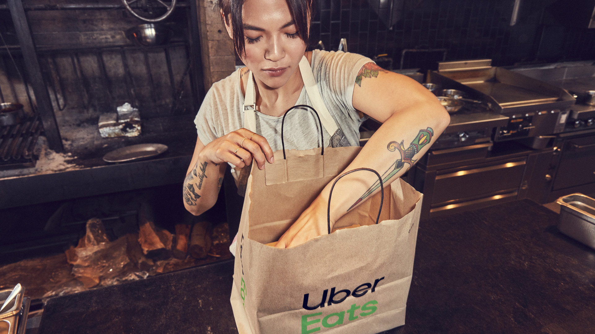 A person with tattoos is holding a brown paper bag with the words 'UBER EATS' written on it. They are standing in a kitchen with various cooking utensils and appliances around them. | Uber Eats food delivery | e1517b211e262aa0a1eee5da6c52907563fe70b78387e4db7b6b95a51fcc8e29 | 001065735284 | 0 | 0 | 32 | 4 | 0 | 0 | |
