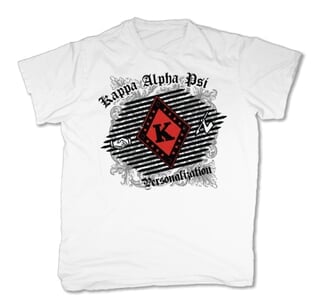 A white t-shirt with a graphic design featuring the letters 'KAPPA' in a stylized font, a red diamond with a black stripe in the center, and the word 'PERSONALIZATION' below it. The design also includes the phrase 'Alpha Psi' above the diamond and 'Kappa Alpha Psi' written in a circular pattern around the diamond. The ... | Kappa Alpha Psi Screen Printed T-Shirt Design #19 | cef8a29c6a72a16b5a14600106a6e64266fb05b9a800e746667e4417c3bd7863 | 001065735365 | 0 | 0 | 71 | 8 | 0 | 0 | |