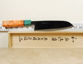 A black-handled knife with a green and orange blade is lying on a wooden cutting board with Japanese characters engraved on it. | Ishikawa White #2 Black Santoku 190mm Custom | 216c7ccc7f4bc2b65580f80643f59c377fb808a97953313c9f9bddc8b16c0e7c | 001065735339 | 0 | 0 | 22 | 7 | 0 | 0 | |