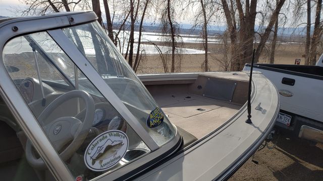 A white pickup truck with a boat attached to its bed is parked on a dirt road. The boat has a clear windshield and a steering wheel visible through the window. There is a sticker on the windshield with a fish and the words 'Fish On'. The surrounding environment includes a body of water and trees in the background. | 2000 Fisher 17 Avenger Sport Erie, Colorado 10 | 35912f15cdbb65f994d9dc3d5ff57abcbb82942ee70e017ff0f93b03d53c5078 | 001065735892 | 0 | 0 | 59 | 8 | 0 | 0 | |