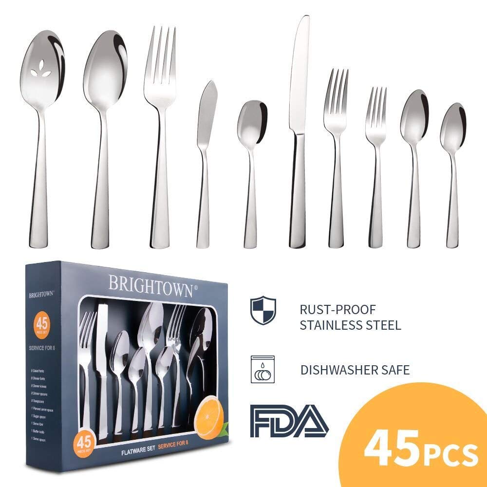A set of stainless steel utensils, including forks, knives, and spoons, is displayed in a box with a 'Brighthown' logo. The utensils are arranged in a way that shows their design and quality. The box also features a 'Rust-Proof, Stainless Steel, Dishwasher Safe' label, and the price is indicated as '44.95 Pcs'. | MineTom 20-Piece Stainless Steel Flatware Set with Gift Box Service for 4 Dishwasher Safe | f3c1b4668087c102e7c68d82c263e9d550c73cdb1dcb78d2cc16164e384040e0 | 001065735833 | 0 | 0 | 52 | 14 | 0 | 0 | |
