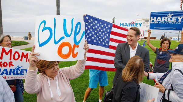 A group of people is gathered outdoors, with some holding signs and a man in a suit standing in the center. One of the signs reads 'Blue O.C.' with a blue and orange design. The group appears to be engaged in a political rally or event. | Democrat Harley Rouda greets supporters at a rally in Laguna Beach, Califor | 7e8c012d80b39a55d35343d53452237a238d9fd6b8cfaf082140a7b660426dfd | 001065735794 | 0 | 0 | 46 | 12 | 0 | 0 | |