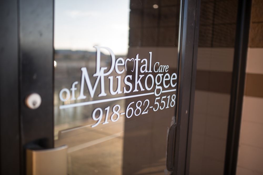 The first image shows a close-up of a glass door with a sign that reads 'Dental Care of Muskogee' in white letters on a black background. The sign is attached to the door and has a reflective surface, showing the interior of the building. The door has a metal handle on the left side and a metal lock on the right side. ... | Dental Care of Muskogee: 2406 E Shawnee Rd, Muskogee, OK | 61d47ee0c3a1f11c44008669ad5f32569c12b9d760a9141481759424e5bb983c | 001065736108 | 0 | 0 | 84 | 10 | 0 | 0 | |