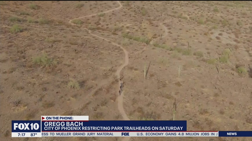 Aerial view of a desert landscape with a dirt path winding through it. The path is marked with a red line indicating the route. The surrounding area is covered in dry, brown vegetation. There are no signs of life or human activity, and the sky is clear. | City of Phoenix restricting park trailheads on Saturday | 7c7879b2eaeac7081ad8c810daa462b676f51e40346b8d93f12d40da50553623 | 001065736486 | 0 | 0 | 47 | 8 | 0 | 0 | |