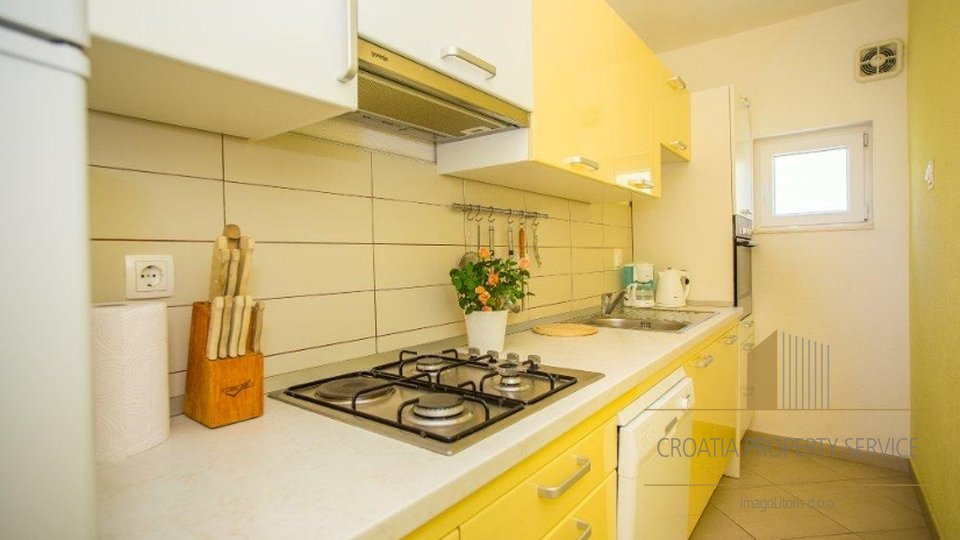 A small, tidy kitchen with yellow cabinets and white countertops. The kitchen features a stove with a pot on it, a sink with a dish rack, and a window with a view of the outside. There are various kitchen utensils and a potted plant on the countertop. | APARTMENT HOUSE LOCATED 100 METERS FROM THE SEA, \xc4\x8cIOVO! | 1d82bd33f8a42805b0389db3a13c5151ccd25fe3cc178bead9d91d9a3add9caa | 001065737271 | 0 | 0 | 47 | 9 | 0 | 0 | |