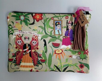A colorful embroidered fabric with a variety of designs, including a woman in traditional attire, skulls, and a fruit, is displayed. The fabric is attached to a white surface with a pink tag hanging from the top right corner. | Clutch Frida Kahlo | 27e1e5d889e7f84528035a60a8c8f227ae077141e55b2c144e86719a3285dd0e | 001065737051 | 0 | 0 | 39 | 3 | 0 | 0 | |