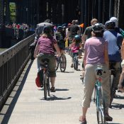 A group of people is riding bicycles on a bridge. The bridge is crowded with people walking and cycling. There are multiple bicycles in the scene, with one prominently in the foreground on the left side. The cyclists are wearing various clothing, including helmets and backpacks. The bridge has a railing on the left sid... | Bike traffic advisory: Expect delays on bridges due to repairs and Fleet Week | d92b298c263dc82d706079e8eeff5ec6ebb5c4f33eb9f40dc4f0034693078613 | 001065738056 | 0 | 0 | 66 | 13 | 0 | 0 | |