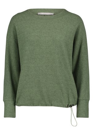 A plain green top with a ribbed texture and a straight neckline is displayed against a white background. The top has short sleeves and a relaxed fit. A small, thin, white drawstring is visible at the bottom of the neckline. | Sweatshirt - middle green melange | fc1927a4876962ebccf6d077df66a27368e24e6fb26adfbc0a23239a85f88429 | 001065738135 | 0 | 0 | 40 | 5 | 0 | 0 | |