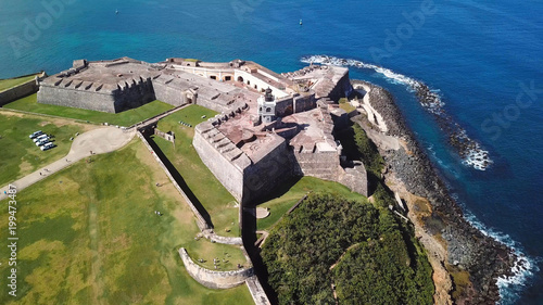 Aerial view of a large, historic castle with multiple towers and a central keep, surrounded by a lush green hillside. The castle is situated on a rocky coastline with the ocean visible in the background. There are several cars parked outside the castle, and a small boat is visible in the water. | Fortification Aerial view of Castillo San Felipe del Morro in San Juan, Puerto Rico. | 601d1210b472d98ff6f76531fa78c7060e57f579a35c42b776766a685d914d0a | 001065739295 | 0 | 0 | 52 | 14 | 0 | 0 | |