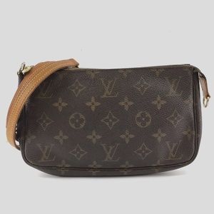 A brown leather Louis Vuitton handbag with a gold buckle and a monogram pattern is displayed against a white background. | Preowned Louis Vuitton Accessory Pochette Monogram | 1d259d1bc9b2409b387419089df98b3addb08a653214835b01a90b0c3d91a107 | 001065739331 | 0 | 0 | 20 | 6 | 0 | 0 | |