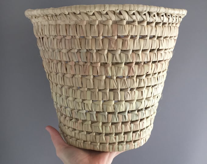 A large, woven basket with a textured surface and a tall, cylindrical shape is being held by a person's hand. The basket has a natural beige color and is set against a plain, light-colored background. | Hand woven waste paper basket / bin | 860aaaea694e1f89791d9186d3c282fc2a28a7f94fb601d3f0bf66e7531c09ce | 001065739205 | 0 | 0 | 35 | 7 | 0 | 0 | |