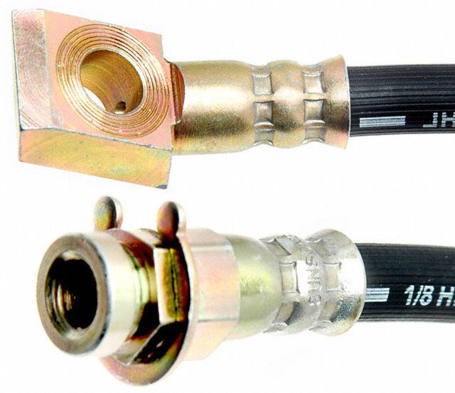 A close-up image of a copper-colored connector with a black hose attached to it. The connector has a series of circular holes and a metallic tag with the letters 'JH' and a number '18' on it. The background is a plain white color. | ACDELCO GOLD/PROFESSIONAL BRAKES - Brake Hydraulic Hose (Front Right) - ADU 18J822 | a1a3f8369fe07789f7703bd930bacf9de864f8a9a621cb4ec12d656518bc6b6e | 001065739256 | 0 | 0 | 43 | 12 | 0 | 0 | |