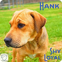 A brown dog with a white chest is standing on a grassy field. The dog has a shiny coat and is looking directly at the camera. The background is a blurred green field, and the image has a caption at the top that reads 'HANK' in blue letters. Below the dog, there is a smaller text that says 'SHY LOYAL' in blue letters. | Adopt A Pet :: Hank - Washburn, MO | 77ab25a960a620d2751b2d7353a42fe473edabb61ef07b97472555781568cb78 | 001065739349 | 0 | 0 | 63 | 8 | 0 | 0 | |
