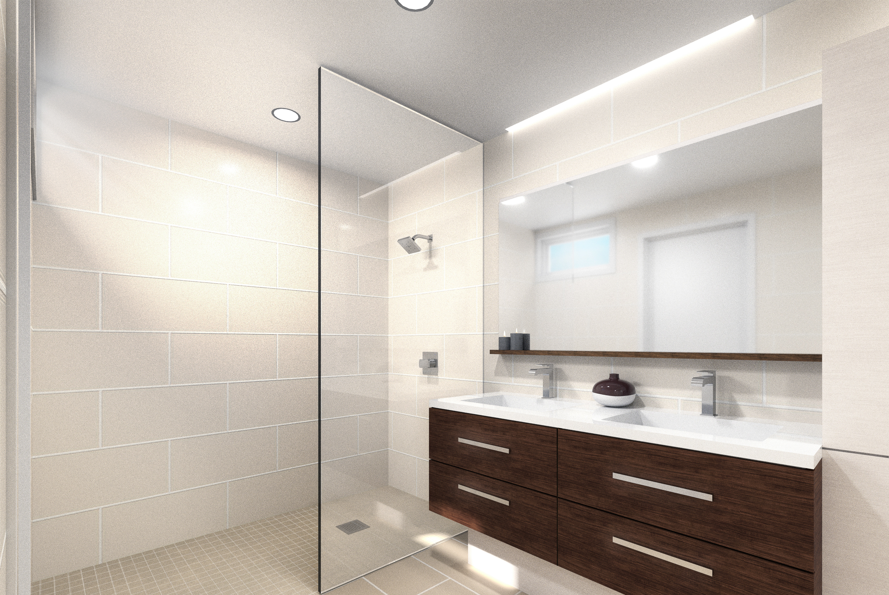 A modern bathroom with a large mirror above a wooden vanity with two drawers. The vanity has a white countertop with a faucet and a soap dispenser. To the left of the vanity, there is a glass shower enclosure with a clear door and a showerhead mounted on the wall. The floor is tiled in a light beige color, and the walls are tiled in a similar shade. There is a single light fixture on the ceiling, and the room is well-lit. | 3D Renderings for New Construction: 7 Reasons It Can Help Pre-Sell | 0ddac3e127f6a02dc50ebd490b7927622c9c8405d32eb68a77d888bf2ed499b6 | 001065739305 | 0 | 0 | 82 | 11 | 0 | 0 | |
