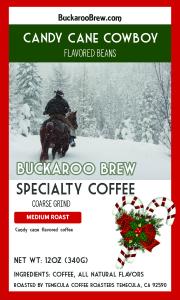 A festive holiday-themed coffee advertisement featuring a cowboy riding a horse through a snowy landscape. The cowboy is wearing a hat and a scarf, and the horse is adorned with a saddle. The background shows a snowy forest with trees. The advertisement includes a red and green color scheme with a wreath and holly leaves in the foreground. The text reads 'BUCKAROO BREW SPECIALTY COFFEE' with 'CANDY CANE COWBOY FLAVORED BEANS' written below. The ingredients and flavor profile are listed at the bottom, along with the company's website and address. | Buckaroo Brew Now Shipping Holiday Seasonal Roasted Coffee 1 | f50954fc7368ee02cee376eb0b8ddc8410ad8904e5467b67fb4564f258a243b4 | 001065739211 | 0 | 0 | 90 | 9 | 0 | 0 | |