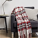 A red and white checkered blanket is draped over the back of a black armchair. The chair is positioned in front of a small black side table with a white lamp on top. The scene is set against a plain white wall. | Amazon Basics Plaid Throw Blanket | 39667536c55769d43b150ae2788886fea59b1eda09b5fa66d4576e092b3a5632 | 001065739547 | 0 | 0 | 42 | 5 | 0 | 0 | |
