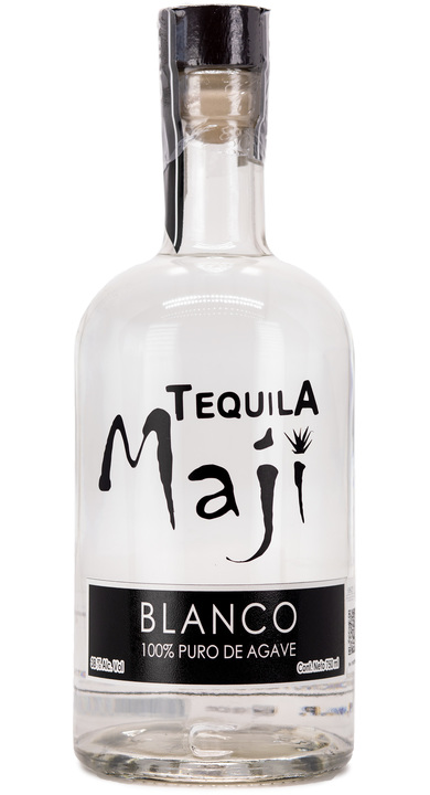 A clear glass bottle with a black cap and label, containing a white liquid. The label reads 'TEQUILA MAJII BLANCO' with a stylized 'M' and 'A' in the center, surrounded by a leaf design. The bottle is placed against a white background. | Bottle of Tequila Maji Blanco | a2494e4a168c4a8962ccbc36959407c50e83214a8bf3d8005a690cfc60347262 | 001065739538 | 0 | 0 | 42 | 5 | 0 | 0 | |