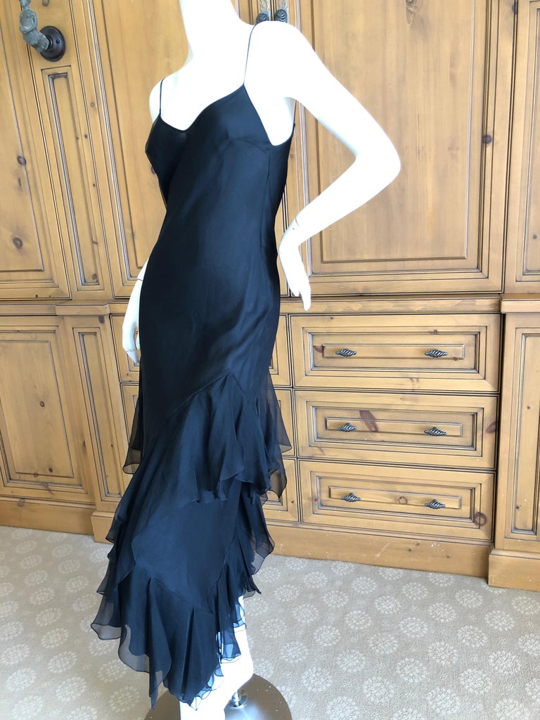 A mannequin is dressed in a black, sleeveless, strapless, and ruffled evening gown with a fitted bodice and a flared skirt. The gown has a high slit on the left side, revealing the mannequin's leg. The mannequin is positioned in front of a wooden cabinet with several drawers and a door, which is closed. The cabinet has a warm, brown color and is adorned with decorative handles. The mannequin is standing on a white platform, and the scene is set against a plain, light-colored wall. | John Galliano 1990's Bias Cut Black Slip Dress with Flamenco Ruffles In Excellent Condition For Sale In San Francisco, CA | b23c6491ceb32537841789e27e5704116c3d4a9d9071f0b7b7deb6b5583de618 | 001065739743 | 0 | 0 | 85 | 20 | 0 | 0 | |