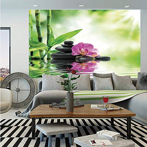 A modern living room with a large window, a gray sofa with multiple cushions, a wooden coffee table with a vase of pink flowers, a stack of books, and a glass of red wine. The room has a black and white striped rug, a gray ottoman, and a large green wall mural depicting a bamboo forest with a pink flower. There is a white spherical object on the floor and a gray throw blanket on the sofa. | Spa Decor Removable Wall Mural,Orchids and Rocks in The Mineral Rich Spring Water Spiritual Deep Treatment Cure Image,Self-Adhesive Large Wallpaper for Home Decor 66x96 inches,Green Black Pink | 160ce56a456c284663dbf35e4647b639e492e0546d89bb4b112d49d9aaaad495 | 001065739739 | 0 | 0 | 77 | 27 | 0 | 0 | |