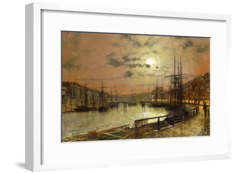 A framed painting of a harbor scene at night with a full moon and stars in the sky, ships in the water, and buildings along the shore. The painting is displayed against a white background. | Whitby-John Atkinson Grimshaw-Framed Art Print | 1a43a481a054dc32a4d1df6cb474f3e047cd066bd3e80ef22e7f13218db20b5d | 001065739707 | 0 | 0 | 35 | 5 | 0 | 0 | |