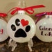 A collection of four white ornaments with a glossy finish, each featuring a black paw print design. The ornaments are adorned with red ribbons tied in bows. The first ornament has a red bow on top and the words 'Ginny' and 'Loki' written in red cursive letters. The second ornament has a red bow on top and the word 'Ginny' written in red cursive letters. The third ornament has a red bow on top and the word 'Loki' written in red cursive letters. The fourth ornament has a red bow on top and the word 'Ginny' written in red c | Christmas pet lover ornament, Dog ornament, Cat ornaments, Christmas tree decorations, Xmas, Personalized ornaments, Animal lover gifts | bd8515ebe7dd368cfddc02d4bb3d4ad96b3498e906ac8ddc2ba82eabbab7222e | 001065740001 | 0 | 0 | 100 | 17 | 0 | 0 | |