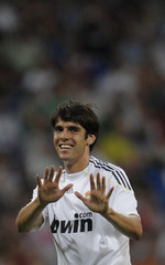 A soccer player with a happy expression is standing on a field, wearing a white jersey with the number 10 on the back. The jersey has the word 'W' on the front and the word 'W' on the sleeves. The player is making a hand gesture with his right hand, holding up five fingers. | Real Madrid's Kaka gestures during their Santiago Bernabeu trophy soccer match against Rosenborg at Santiago Bernabeu stadium in Madrid | cbc0efb0f8865542d97e38ee9d876be04439beafaf761e00b84ae58153ef2768 | 001065740194 | 0 | 0 | 54 | 19 | 0 | 0 | |