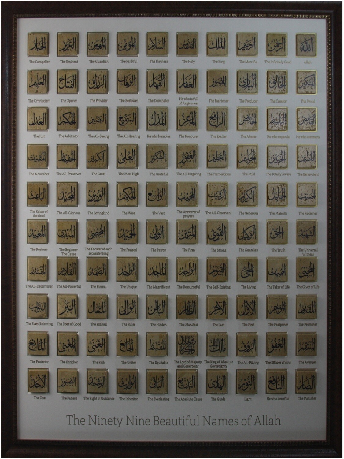 A framed collection of Islamic calligraphy featuring various Arabic phrases and verses. The calligraphy is arranged in a grid pattern with each piece occupying a square space. The frame is ornate with a dark border, and the calligraphy pieces are in shades of gold and brown, with intricate designs and lettering. The overall appearance is that of a traditional Islamic art piece. | 99 Names of Allah in Large Portrait Design in Brown Leather Veneer Frame | 6a9d9e30fb77fc4c52ca2b38cf13feb96b449871c41fe9400f3a9b24db96b8ae | 001065740468 | 0 | 0 | 62 | 13 | 0 | 0 | |
