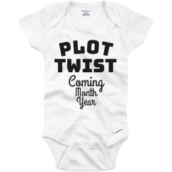 A white onesie with the phrase 'Plot Twist Coming Month Year' in black cursive font on the front. The onesie has a ribbed neckline and cuffs, and a zipper running down the front. The fabric appears to be soft and comfortable. | Pregnancy Announcement Baby Onesie Plot Twist | b0b3b18476d5efa07ea538a6ac1c44b3bb22ec1fa419734ba01eda5233f3ba84 | 001065740589 | 0 | 0 | 41 | 6 | 0 | 0 | |