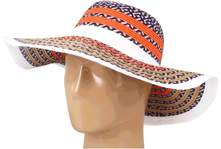 A mannequin head is wearing a wide-brimmed hat with a pattern of white, orange, and black stripes. The hat is positioned on the mannequin's head, covering the top and sides of the head. The mannequin head is facing forward, and the hat is angled slightly to the left. | BCBGeneration Pop Stripe Floppy Hat (White) - Hats | 95cd5090372395f043762c049dd68e8b2d95e8ba9e65849b763475f8dd9c703a | 001065740774 | 0 | 0 | 48 | 8 | 0 | 0 | |